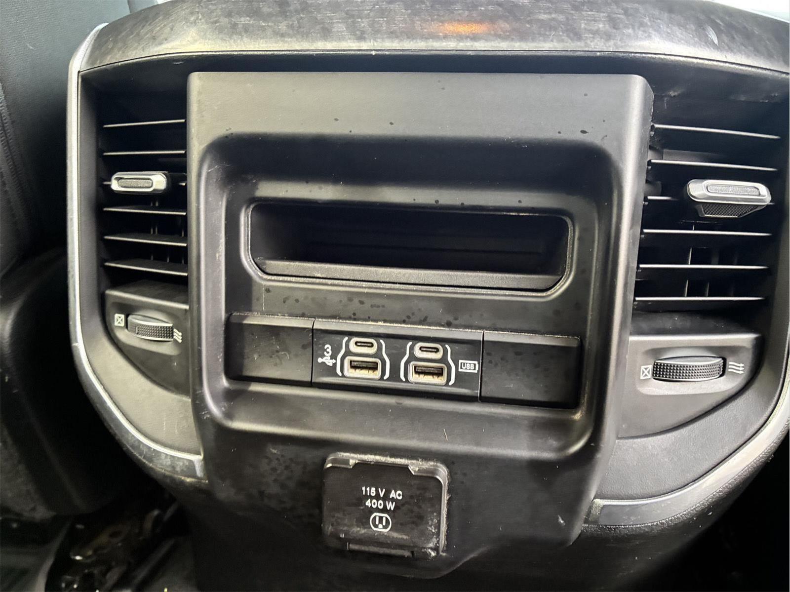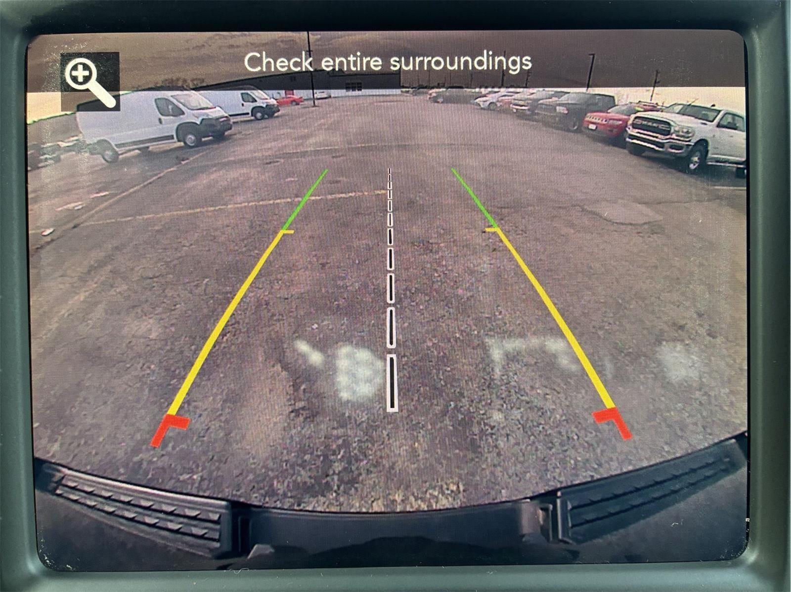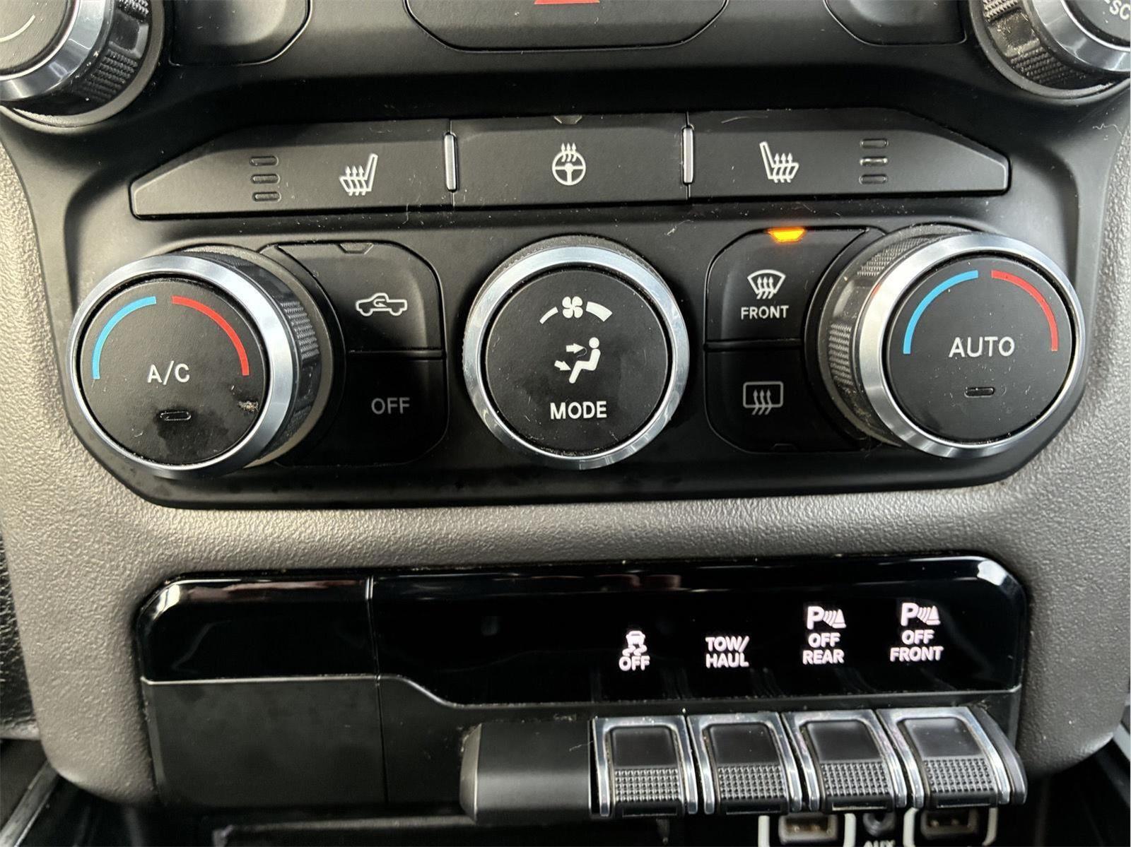 - Includes UConnect 4 with 8.4 inch touch screen display, Apple Carplay, Android Auto, AM/FM radio, single disc remote CD player, one year of SiriusXM Satellite Radio service, media hub with USB and auxiliary audio inputs, dual zone automatic climate control air-conditioning, remote start system, security alarm, universal garage door opener, front heated seats, 8-way power adjustable driver seat with power lumbar, heated steering wheel, power adjustable pedals, rearview auto-dimming mirror, Big Horn IP badge, dual sun visors with illuminating vanity mirrors, glove box lamp, power sliding rear window with defroster, power folding heated exterior mirrors with supplemental signals and courtesy lamps, auto-dimming driver exterior mirror, dampened tailgate, Class IV receiver hitch, rear dome light with on/off switch, and ParkSense front and rear park assist system w/stop.